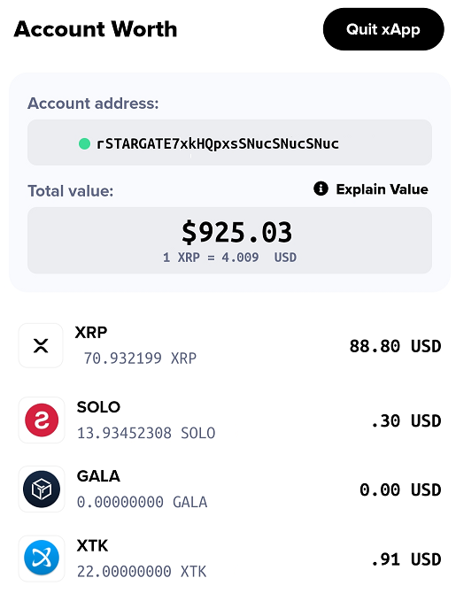 The Account Worth xApp is designed to display the **total** current value of all of the tokens held in your XRP Ledger account.
