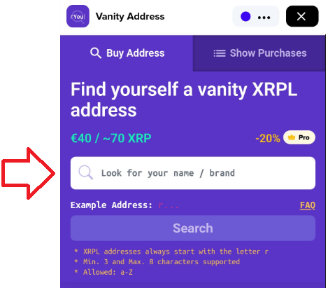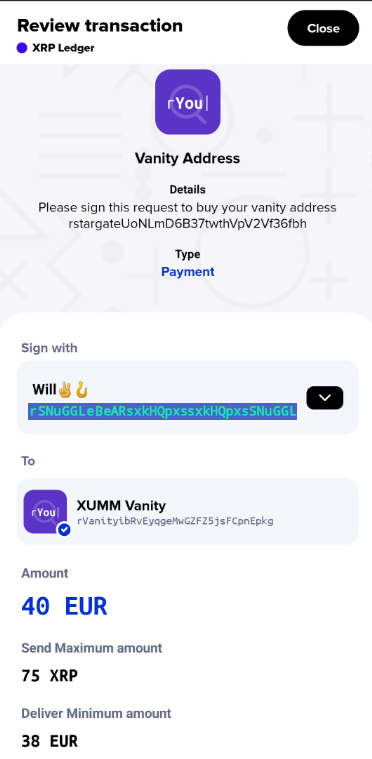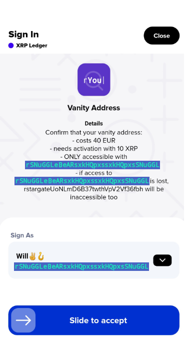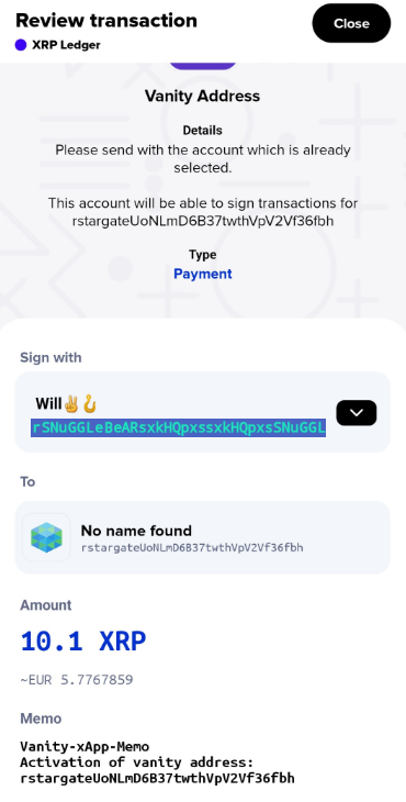 {% embed url="<https://xumm.app/detect/xapp:xumm.vanity>" %}