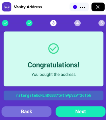 Congratulations! You just purchased your first Vanity address. Press **Next** to continue.