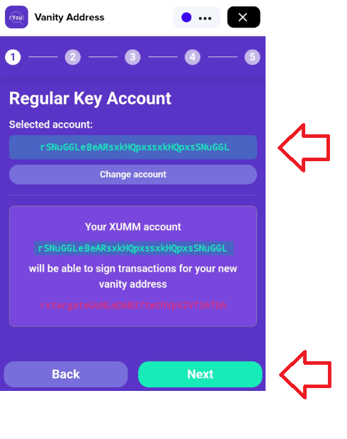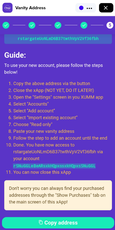 Press the **Copy address** button, then exit the xApp and follow the instructions in this article to import your new Vanity accout into Xumm.