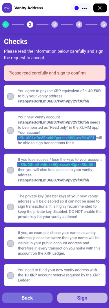 Review and sign the transaction to purchase your Vanity address.