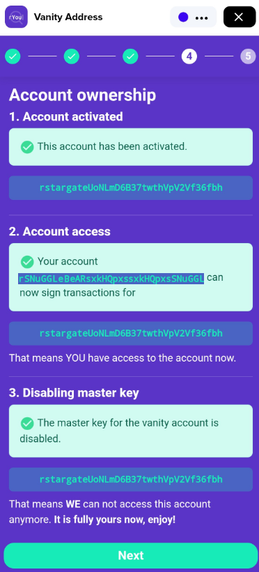 Your new Vanity account should now be activated. You should be able to sign transactions on your new account with your regular key account, and the master key for your Vanity account should now be disabled. Press **Next** to continue.