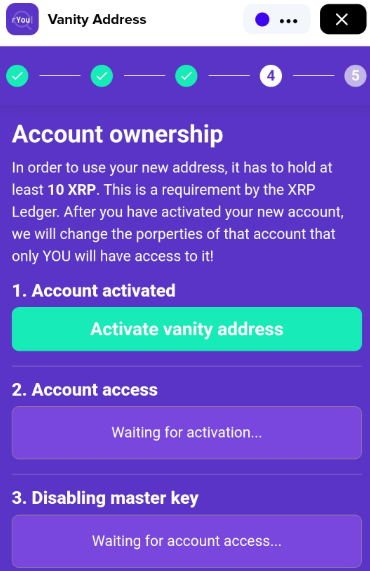 Your new Vanity account needs to be activated with at least 10 XRP. Press the **Activate vanity address** to continue.
