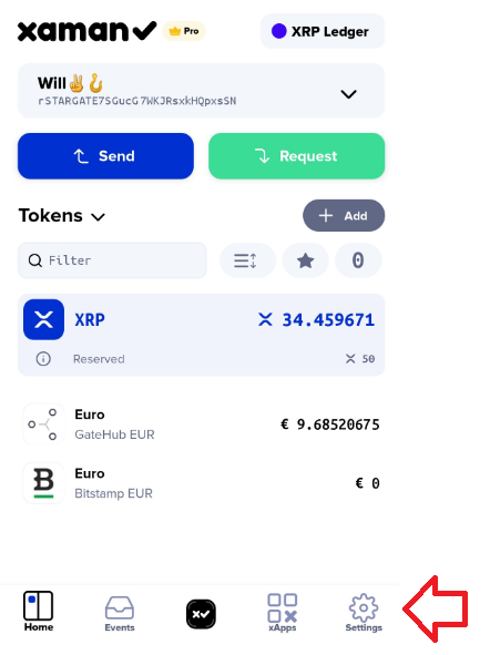 When you launch Xaman (formerly Xumm), the **Settings** button is located on the bottom right hand corner of the screen.