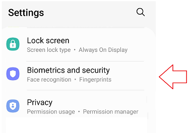 1\) Go into ***Settings*** on your phone and select ***Biometrics and security***.