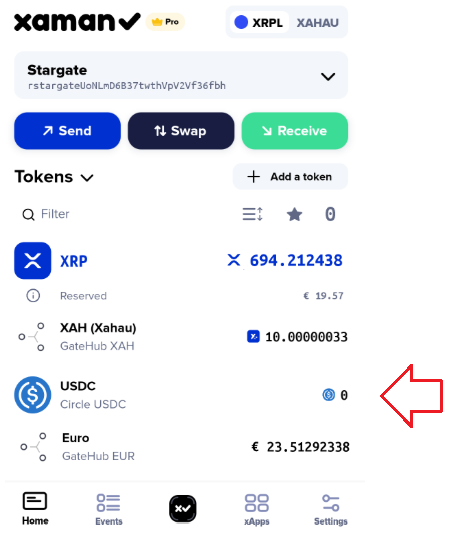 You should now see the USDC token (Trust Line) on the main screen of Xaman: