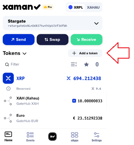 To create a Trust Line for Circle's Ripple's USDC token, press the '**+ Add a token**' button on the main screen of Xaman: