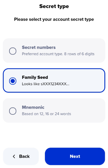 Xaman is compatible with all industry standard account secrets but in this case we will choose **Family Seed** then press **Next**.