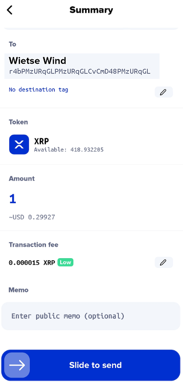 In Xaman, the **Summary** screen is where you can review your transaction to make sure it is correct and where you would enter a destination tag if you needed to.