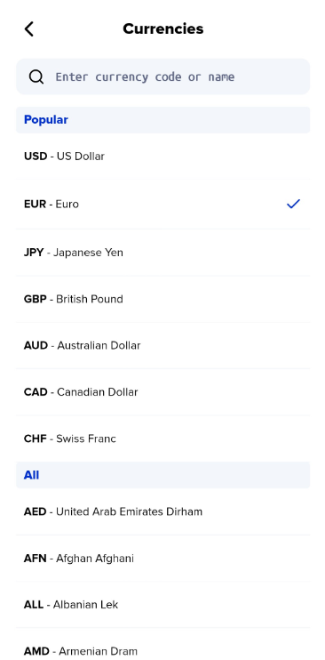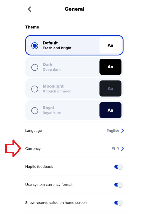 Xaman (formerly Xumm) supports hundreds of different currencies including the most popular ones such as USD, EUR, GBP, AUD and CDN, but also some of the more exotic currencies like LSL, MNT and SAR. Switching between currencies in Xaman is very easy. Just follow the steps below.