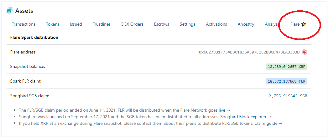 <figure><img src="https://3221812686-files.gitbook.io/~/files/v0/b/gitbook-x-prod.appspot.com/o/spaces%2FMiHAzvIPISVuuzt0AeOR%2Fuploads%2Fgit-blob-9419b33841efc337b4b8f8e40046f9a77ab5a68b%2FXRPScan%20-%20Flare%20claim.png?alt=media" alt=""><figcaption><p>XRPScan</p></figcaption></figure>