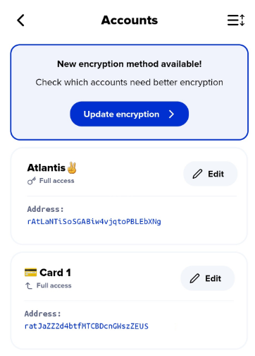 You may have noticed in our example that the "Card 1" account is not displayed in the above image. The "Card 1" account is a Xumm (Tangem) card account so it **can not** be upgraded. (Since the private key is stored on the card itself, not in Xaman.)