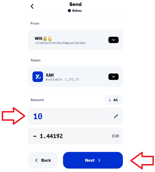 2) Enter the amount XAH coins you would like to send to your GateHub Hosted account, then press the Next button. (In this case, we are sending 10 XAH.)