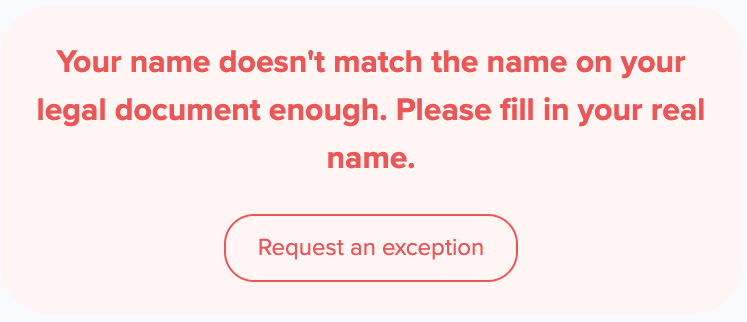 If you are receiving a message saying that you name does not match your legal document, try a couple of variations of your name or request an exception along with an explanation as to why you think you should receive an exception.